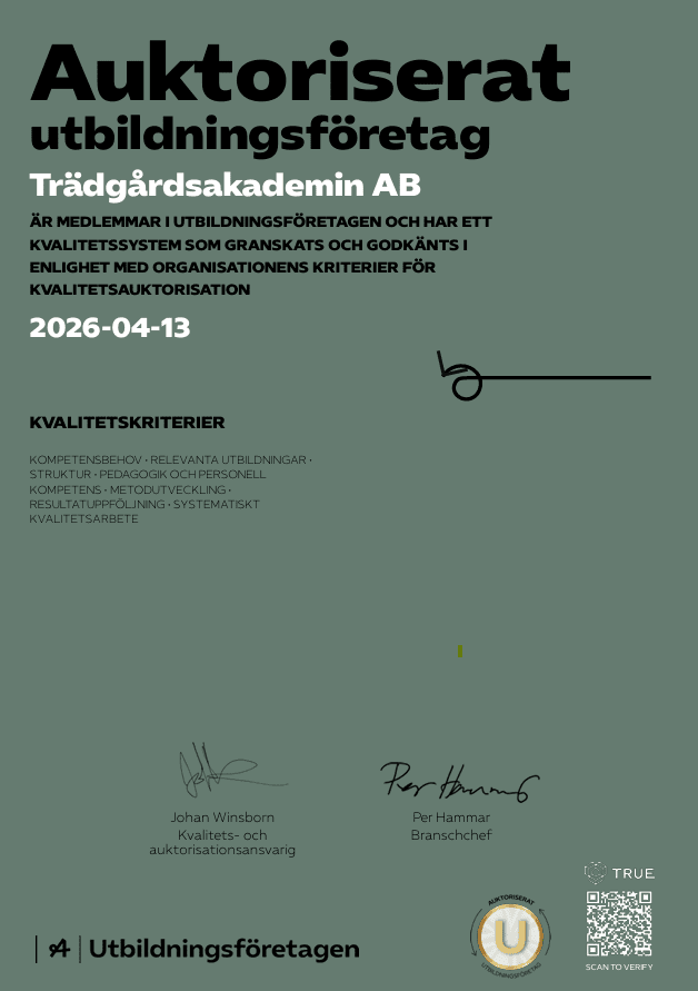 Trädgårdsakademin arbetar förebyggande och långsiktigt med kvalitet som en integrerad del i vår dagliga verksamhet. Vi ser vårt kvalitetsarbete som helt avgörande för vår utveckling och framgång.